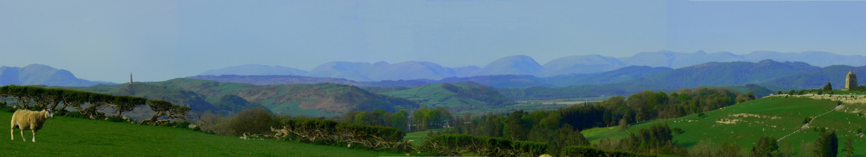 Panoramic shot of the lake district from Birkrigg with the Hoad (John Barrow Monument)on the left, which is a replica of Edison Lighthouse.